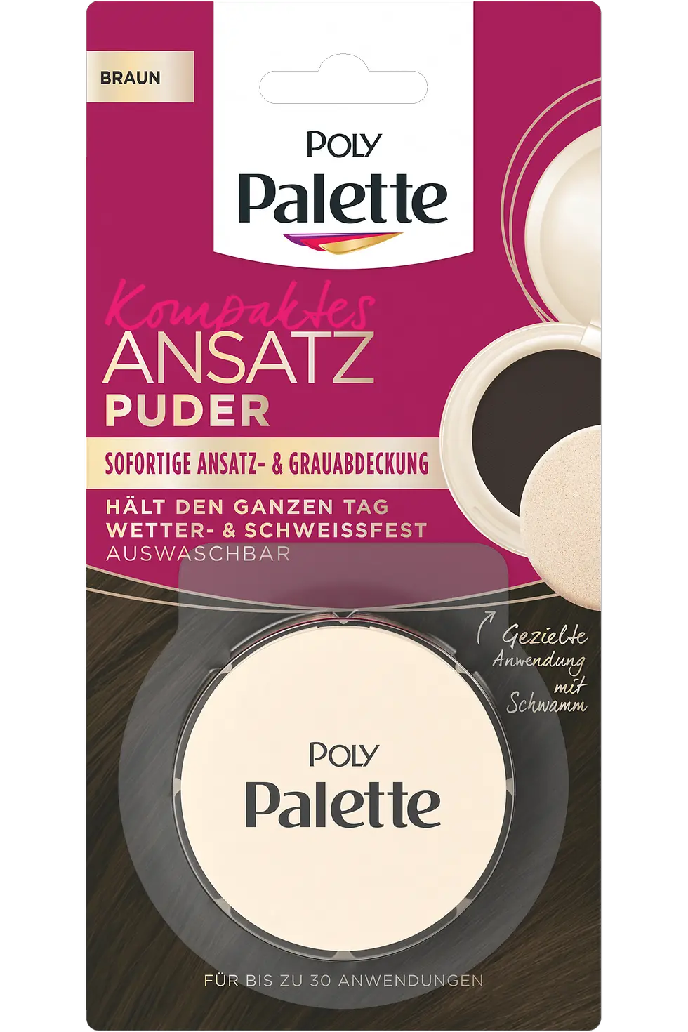 Ein grauer Ansatz und keine Zeit zu färben? Kein Problem! Mit dem kompakten Ansatzpuder von Poly Palette lässt sich der Ansatz in Sekundenschnelle abdecken. Das hochpigmentierte, feste Puder kaschiert graue Haare sofort, ohne sie zu beschweren. Dabei werden die Haare perfekt verblendet – mit natürlich aussehenden Übergängen und ohne zu fetten. Dank des beiliegenden Schwamms lässt sich das Ansatzpuder jederzeit und überall anwenden. Einfach Haare abteilen und das Puder mit dem Schwämmchen auf dem Ansatz verteilen, bis der komplette Ansatz kaschiert ist, fertig! Für perfekt gepflegte, colorierte Haaransätze bis zur nächsten Haarwäsche.
