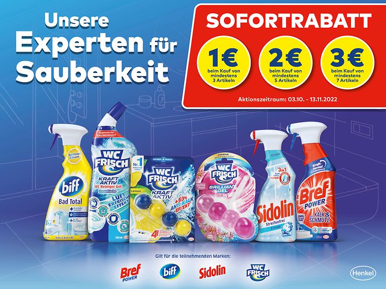 Wer kennt es nicht? Während der Sommermonate und der Urlaubszeit bleibt die ein oder andere Haushaltspflicht liegen. Doch gerade in der nahenden Winterzeit dient die Wohnung als idealer Rückzugsort. Damit die eigenen vier Wände auch im Herbst und Winter perfekt strahlen, dürfen die starken Reiniger-Marken von Henkel nicht fehlen. Die Reinigungs-Experten Bref Power, Sidolin, biff und WC FRISCH sorgen für einen perfekten Glanz, Hygiene und ein angenehmes Dufterlebnis. Umso besser, dass Konsumentinnen und Konsumenten beim Kauf der vier Marken während der Sofortrabatt-Aktion bares Geld sparen können. Die Mechanik dahinter ist wie gewohnt einfach: Beim Kauf von mindestens drei Artikeln spart man einen Euro, beim Kauf von mindestens fünf Artikeln spart man zwei Euro und beim Kauf von mindestens sieben Artikeln spart man ganze drei Euro – und das sofort an der Kasse!