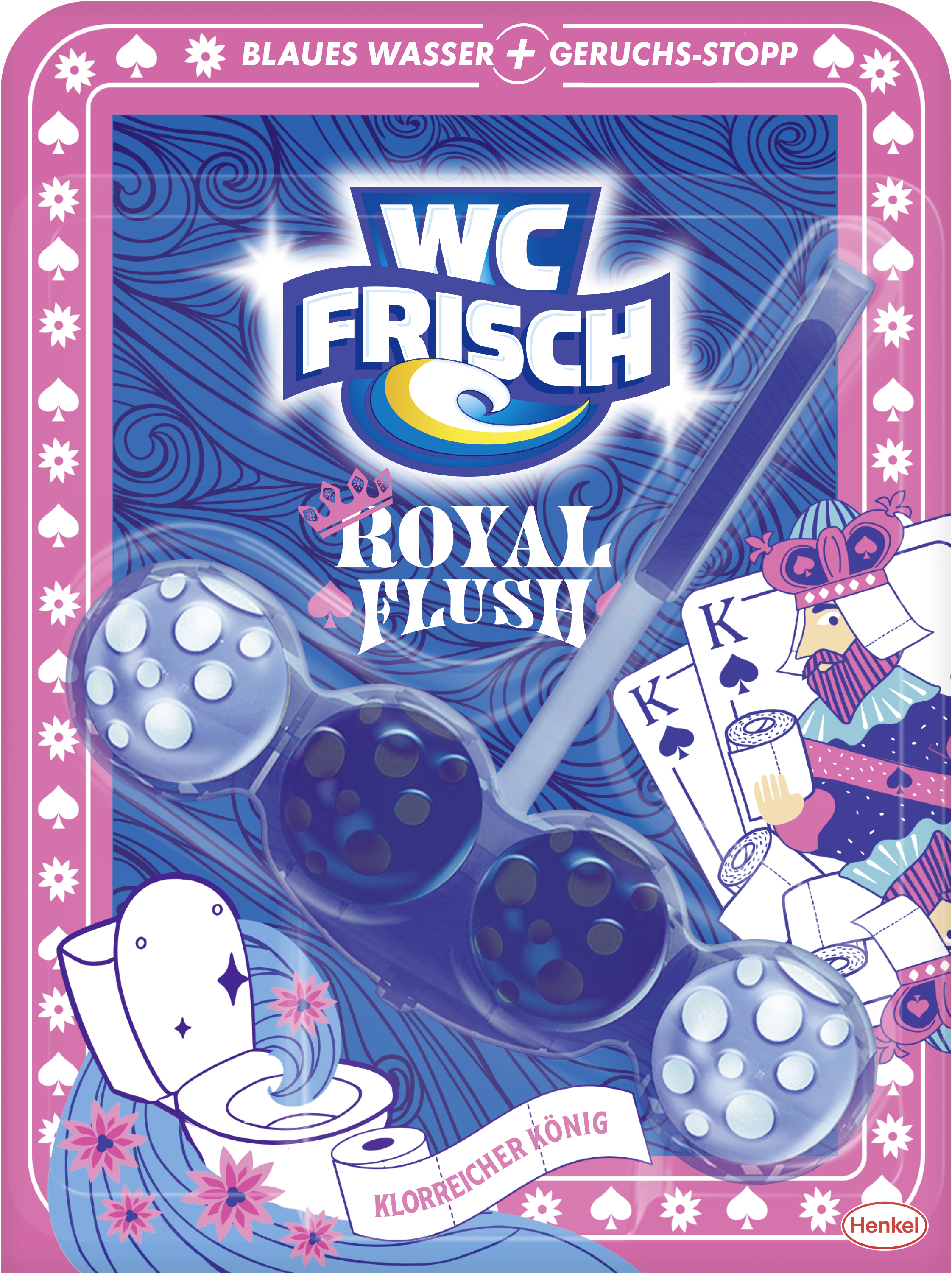 Mit der neuen Limited Edition „Royal Flush“ bringt WC Frisch königlichen Glanz ins Badezimmer – und spielt ein besonderes Blatt aus: Die charismatischen Charaktere „Klorreicher König“, „Dufte Dame“, „Blitzblanker Bube“ und „Jackpott Joker“ verleihen dem stillen Örtchen eine Portion Humor und laden mit einem Augenzwinkern dazu ein, sich eine wohlverdiente Auszeit vom hektischen Alltag zu gönnen. Die Limited Edition ist nur für kurze Zeit im Handel erhältlich – also schnell sein und sich die Edition sichern!
