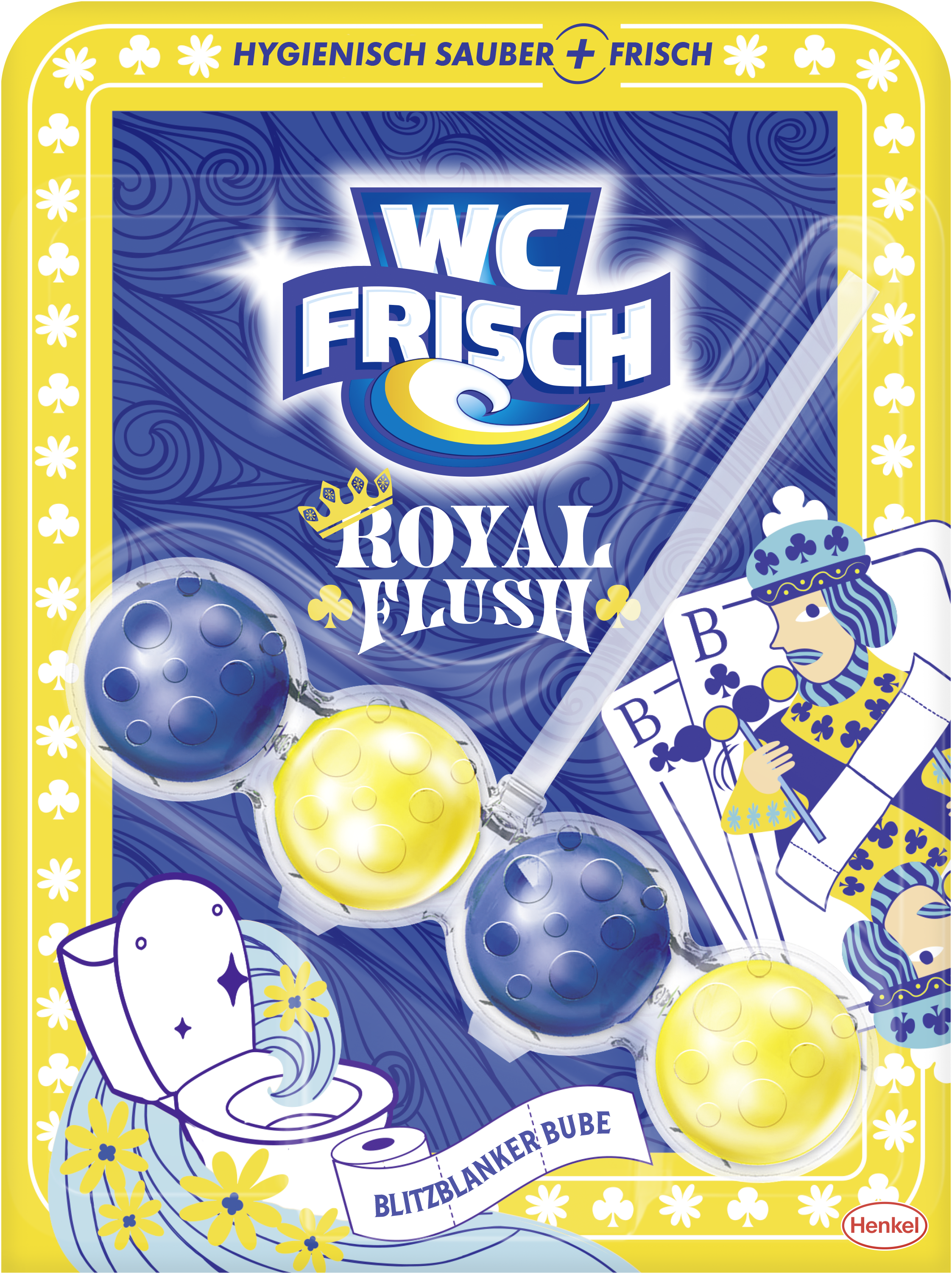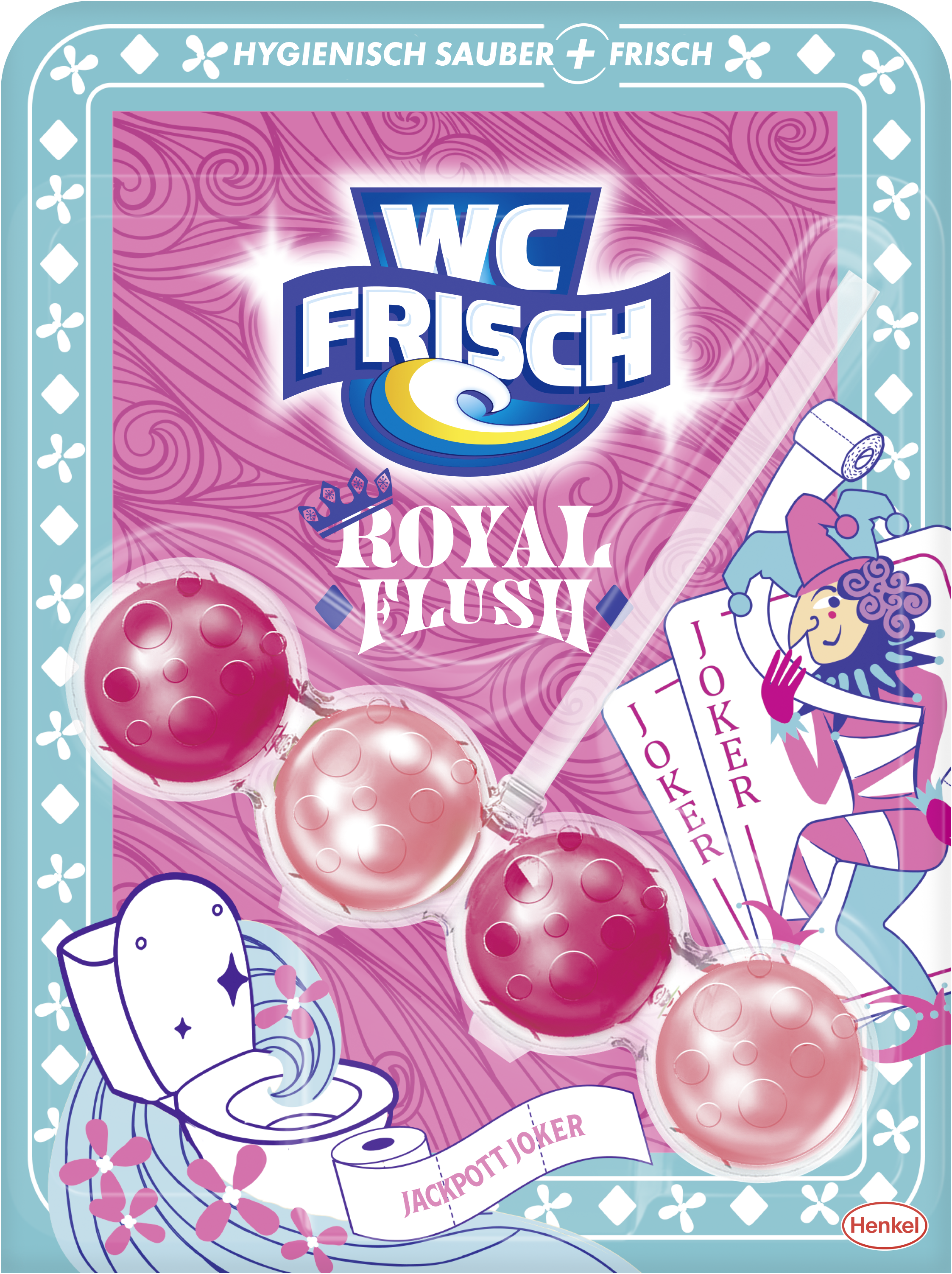 Die unterschiedlichen Varianten der Limited Edition „Klorreicher König“, „Dufte Dame“, „Blitzblanker Bube“ und „Jackpott Joker“ sorgen individuell für ein Frische-Duft Erlebnis und reinigen die Toilette hygienisch sauber. Die Varianten mit Geruchsstopp-Technologie halten zusätzlich unangenehme Gerüche unter der Wasseroberfläche und färben das Wasser gleichzeitig in einen frischen blauen oder lila Farbton. Alle WC-Spüler der neuen WC FRISCH Edition sorgen dank der bewährten Reinigungskraft mit der 4-fach Aktivstoff-Kombination für ein sauberes und glänzendes WC. Der Reinigungsschaum reinigt die Toilette intensiv, während die Anti-Kalk Formel Kalkablagerungen entgegenwirkt. Der Schmutz-Protektor schützt zusätzlich davor, dass neuer Schmutz wieder anhaftet und gleichzeitig sorgen die Kugeln für einen intensiven Duft – für eine langanhaltende Frische bis zu 250 Spülungen.