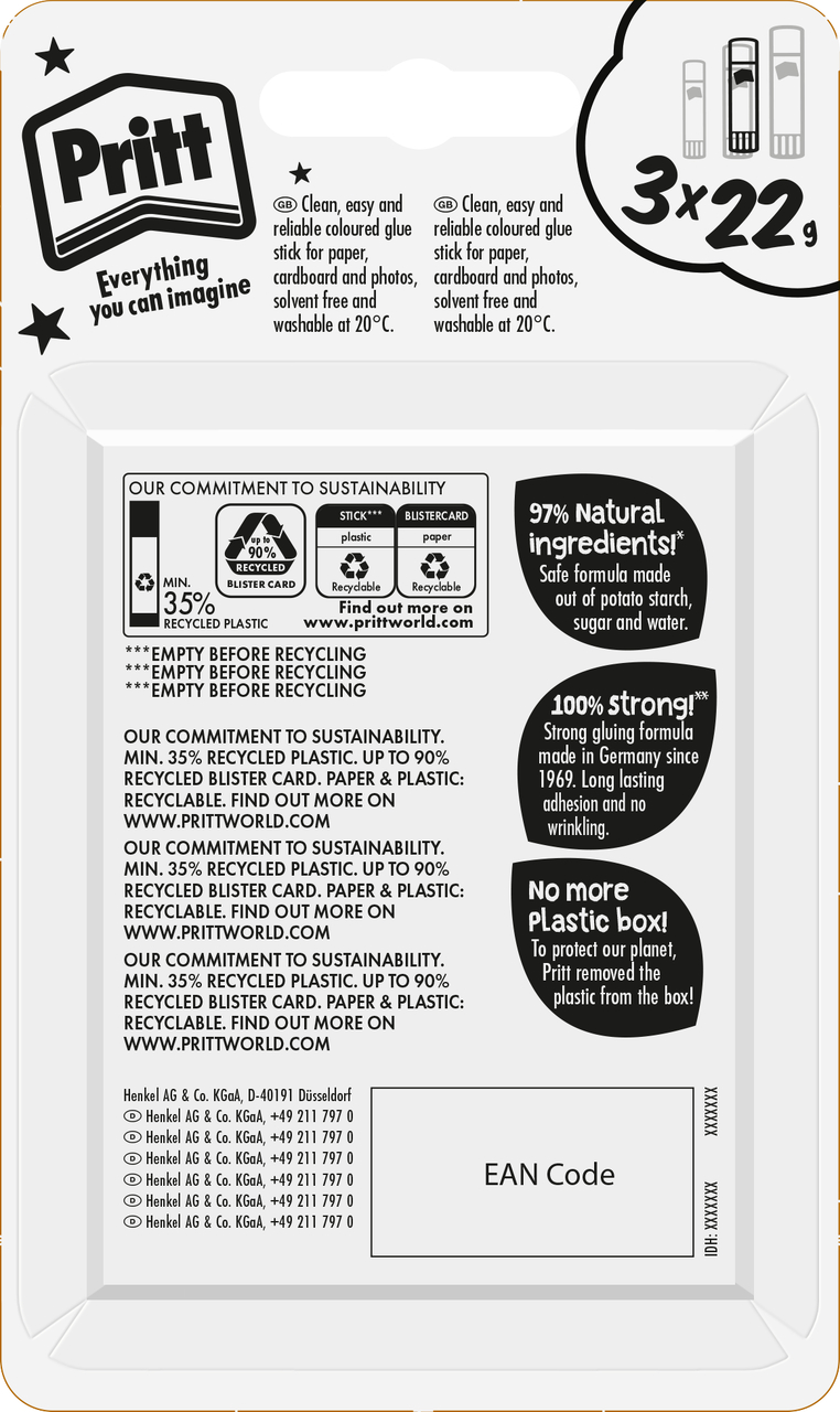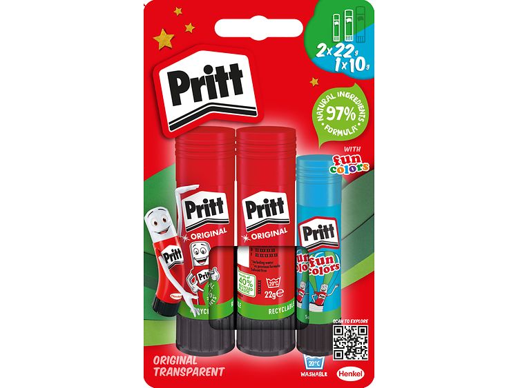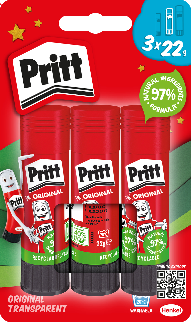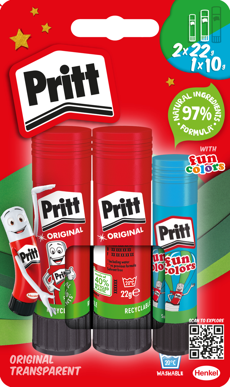 Seit ihrer Erfindung im Jahr 1969 ermöglichen Pritt Klebestifte unzähligen Kindern auf der ganzen Welt, ihre Kreativität beim Basteln auszuleben und ihre motorischen Fähigkeiten zu verbessern. Die aktuelle Generation der Pritt Klebestifte enthält 97 Prozent naturbasierte Inhaltsstoffe (inklusive Wasser) und bis zu 65 Prozent postindustriell recyceltem Kunststoff im Stift – ohne Kompromisse bei der Leistung. Die Produkte bieten eine starke Anfangshaftung, einfaches Korrigieren und erzielen die besten Bastelergebnisse in der Kategorie Klebestifte.