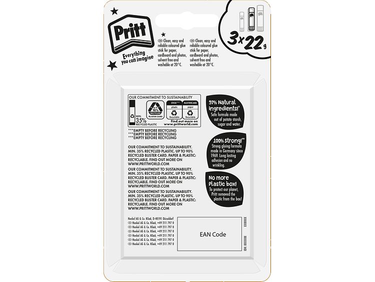 Mit dem aktuellen Verpackungsrelaunch möchte das Unternehmen dieses nachhaltige Konzept weiter verbessern und vereinheitlichen sowie Vertrauen und Erlebnis von Konsumenten stärken. Die neuen Blister verfügen über ein Sichtfenster auf der Vorderseite, damit Kunden die Produkte sehen und berühren können. Darüber hinaus enthält die Verpackung Abbildungen der Pritt Klebestifte in Originalgröße, eine klare Farbkennzeichnung sowie eine Navigationshilfe, mit der die Orientierung und die Kaufentscheidung erleichtert werden. Die Verpackungen bestehen aus FSC-zertifizierten Materialien mit einem Schwarz-Weißen Rückseitendruck, um die Umweltauswirkungen weiter zu reduzieren.