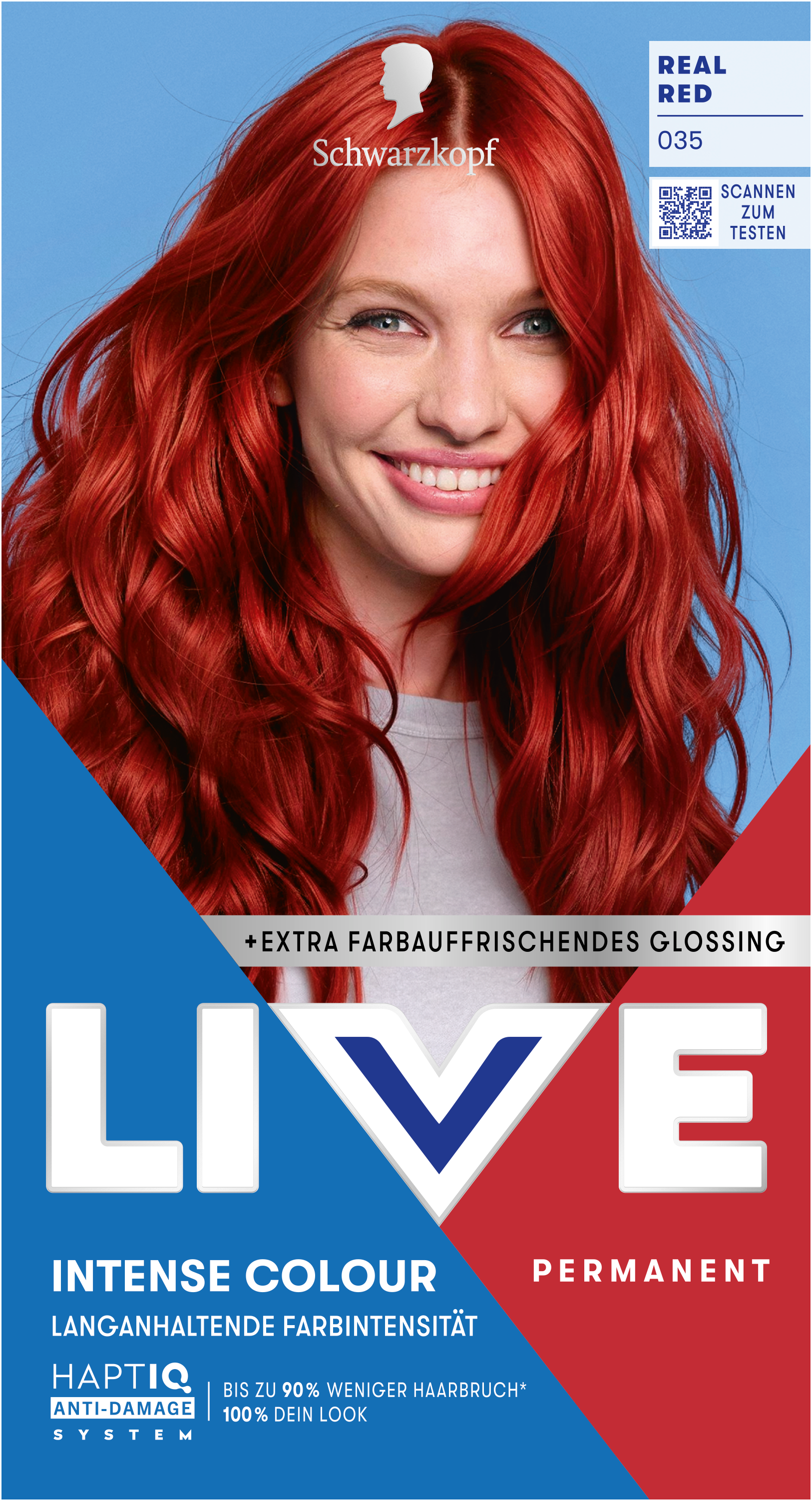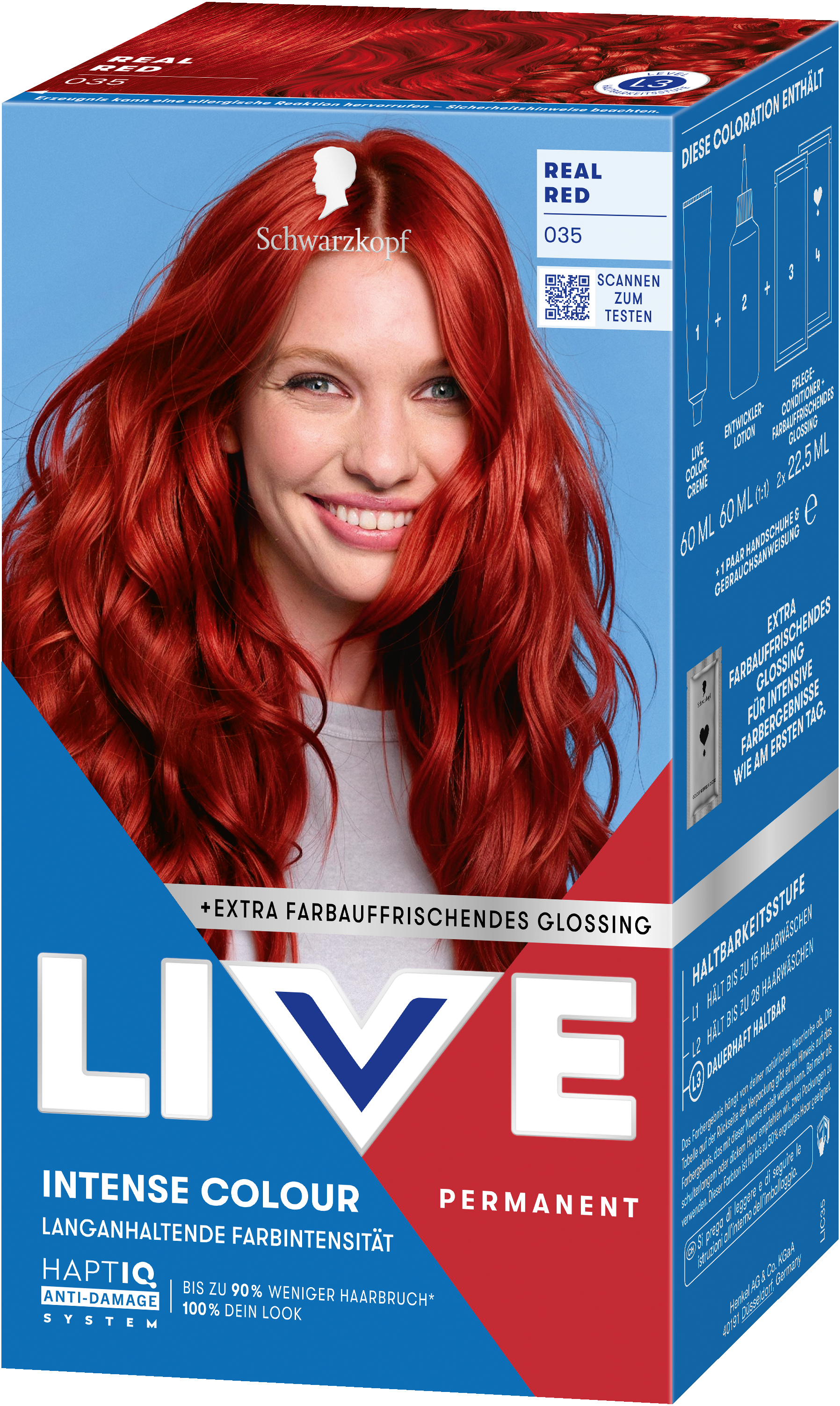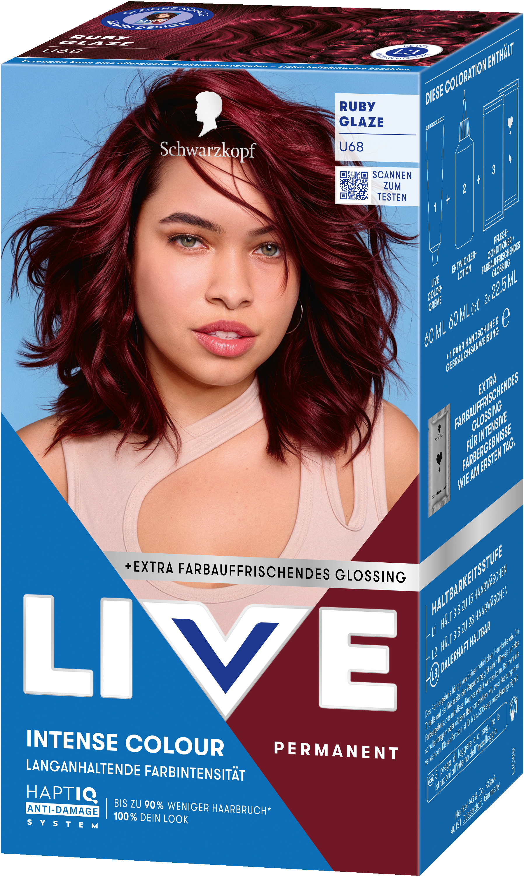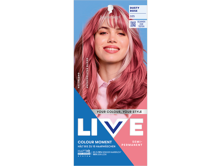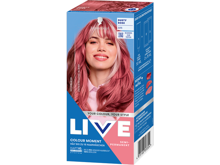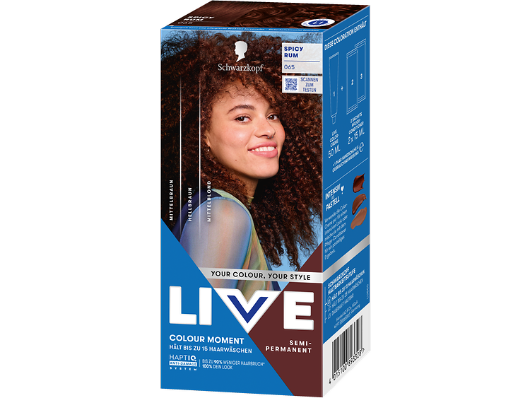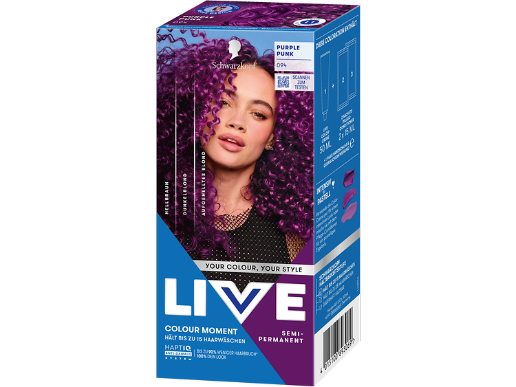 LIVE Intense Colour: für alle, die sich lang anhaltende, lebendige Haarfarben wünschen – ohne Kompromisse! Das integrierte HaptIQ Anti-Damage System schützt das Haar selbst bei den kühnsten Farbexperimenten und sorgt dafür, dass es strahlend gesund und wunderschön glänzend aussieht. Neu ist auch das beigefügte Sachet mit dem farbauffrischenden Glossing – entwickelt, um etwa drei bis vier Wochen nach der letzten Coloration eine zusätzliche Farbauffrischung zu geben. Für eine lang anhaltende, intensive Farbintensität und glänzendes Haar wie am ersten Tag.