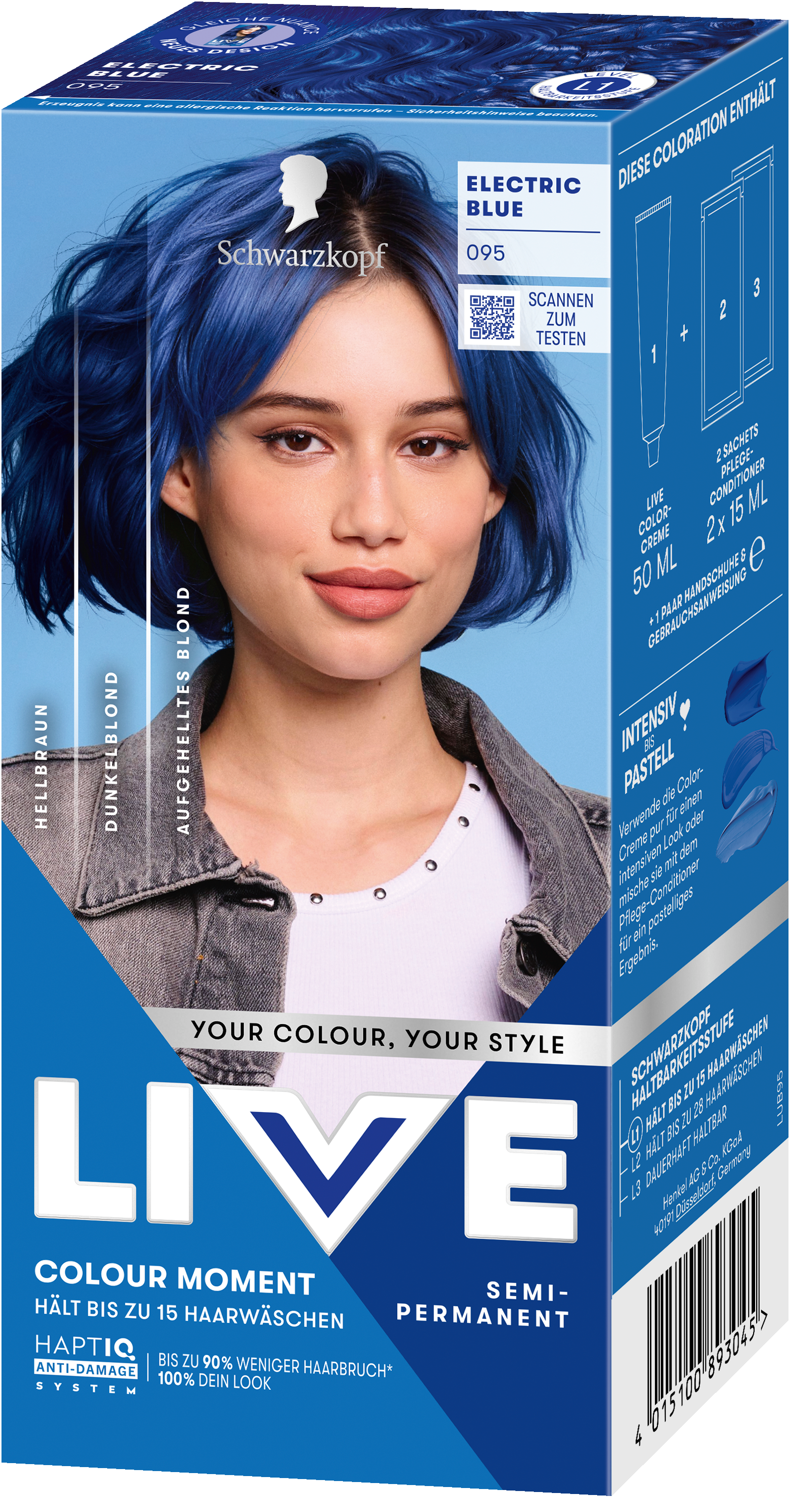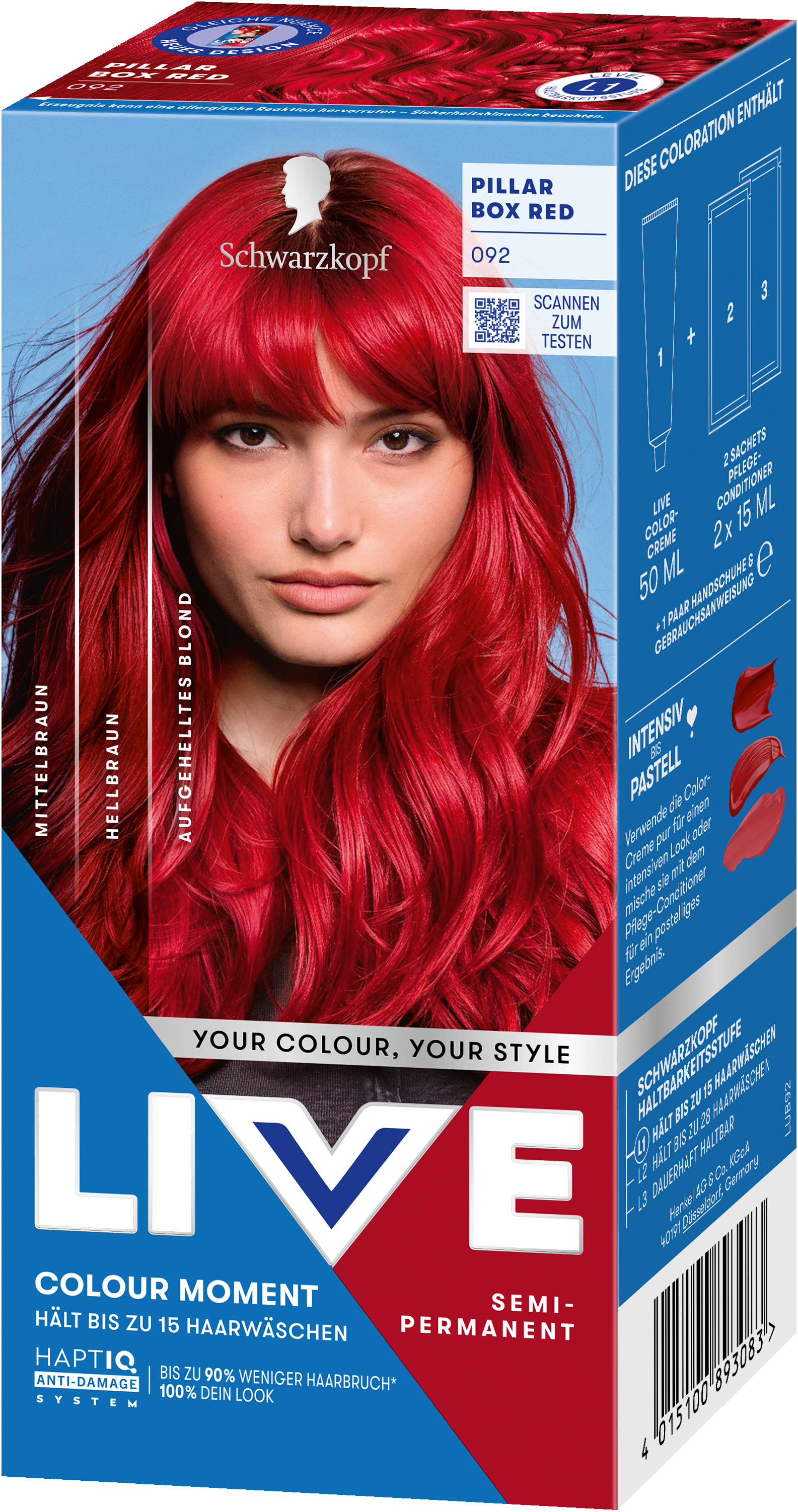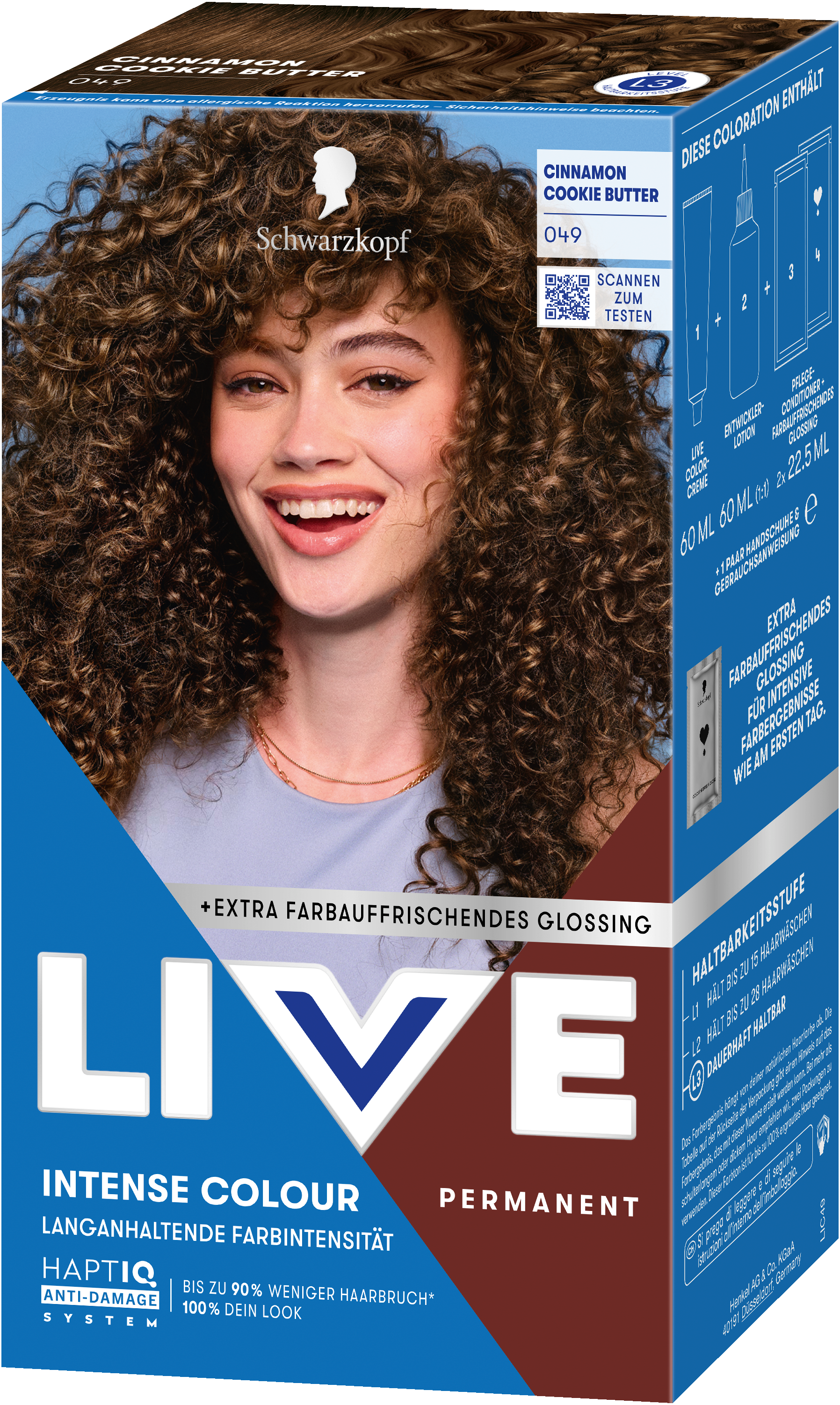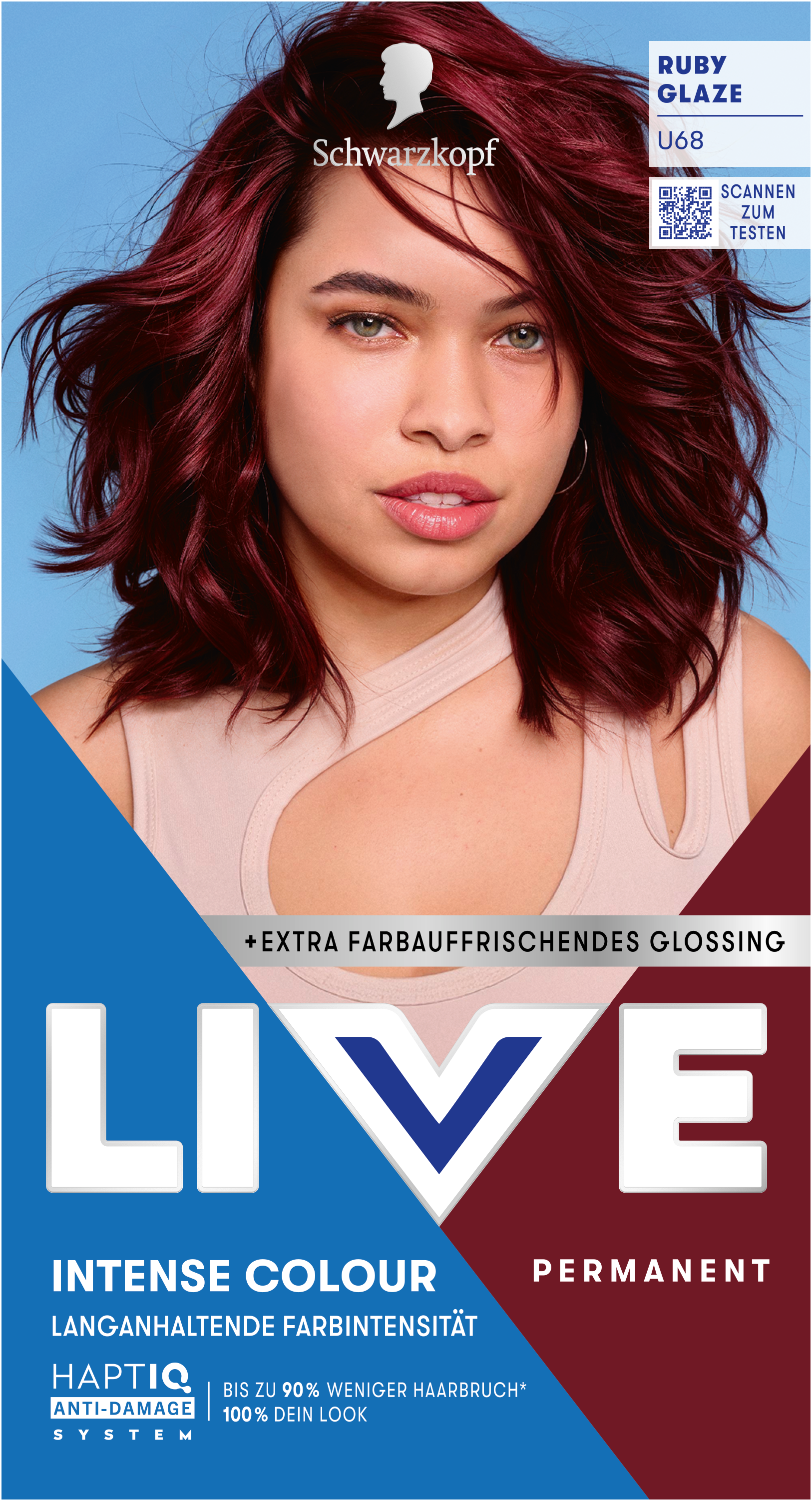 LIVE Intense Colour: für alle, die sich lang anhaltende, lebendige Haarfarben wünschen – ohne Kompromisse! Das integrierte HaptIQ Anti-Damage System schützt das Haar selbst bei den kühnsten Farbexperimenten und sorgt dafür, dass es strahlend gesund und wunderschön glänzend aussieht. Neu ist auch das beigefügte Sachet mit dem farbauffrischenden Glossing – entwickelt, um etwa drei bis vier Wochen nach der letzten Coloration eine zusätzliche Farbauffrischung zu geben. Für eine lang anhaltende, intensive Farbintensität und glänzendes Haar wie am ersten Tag.