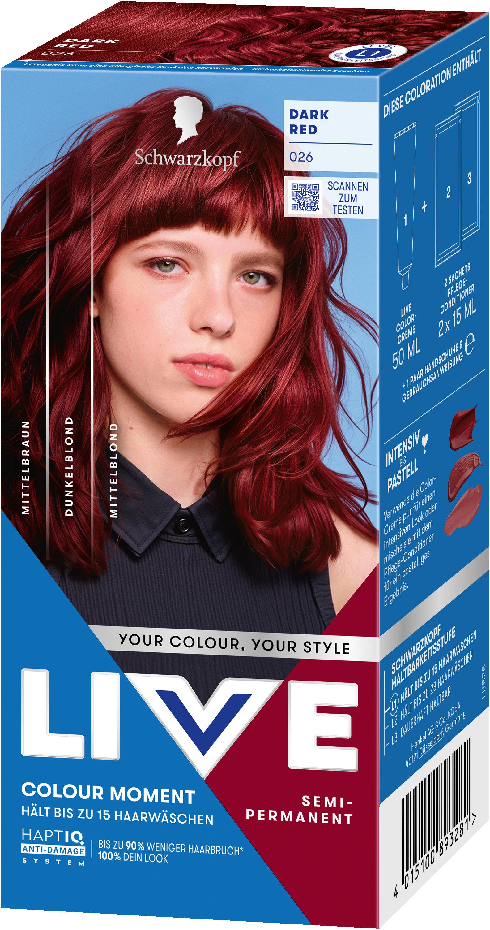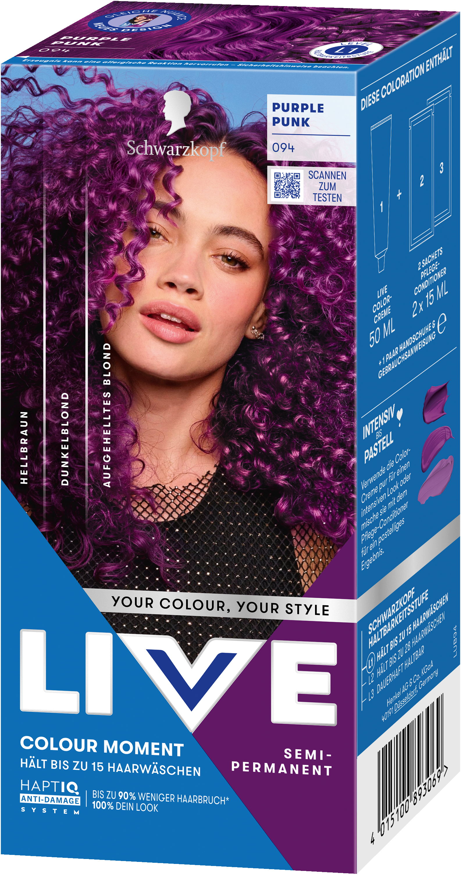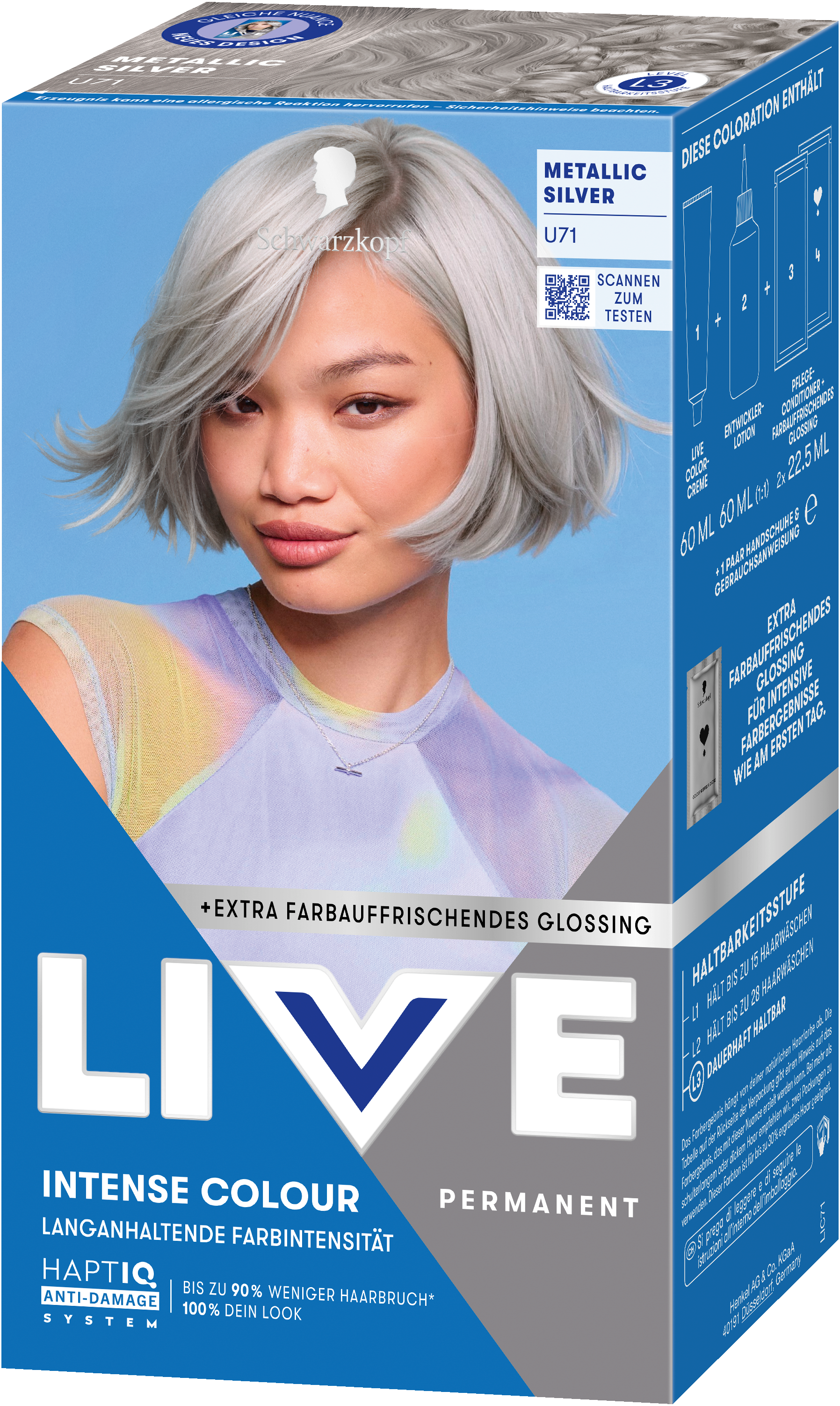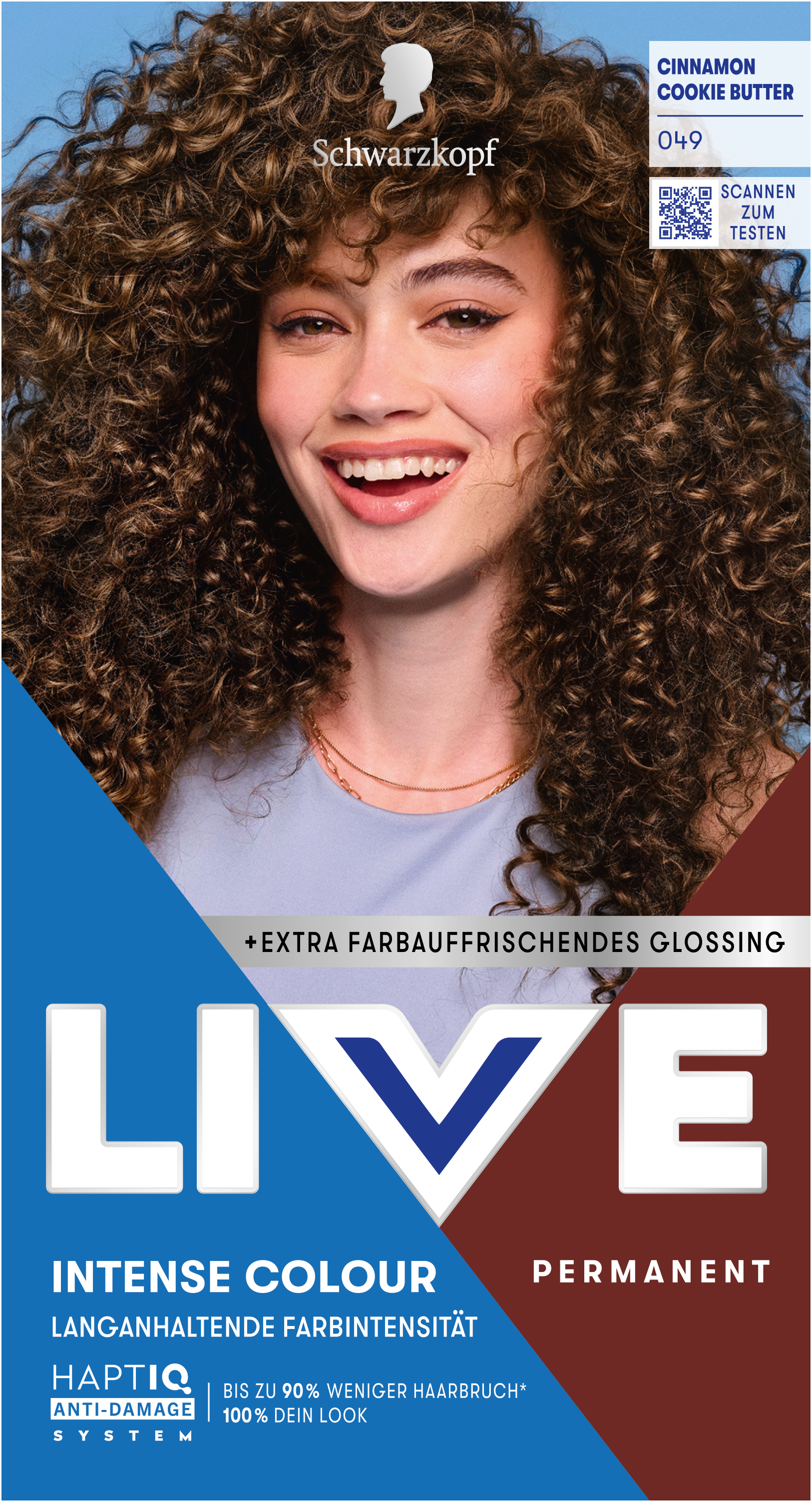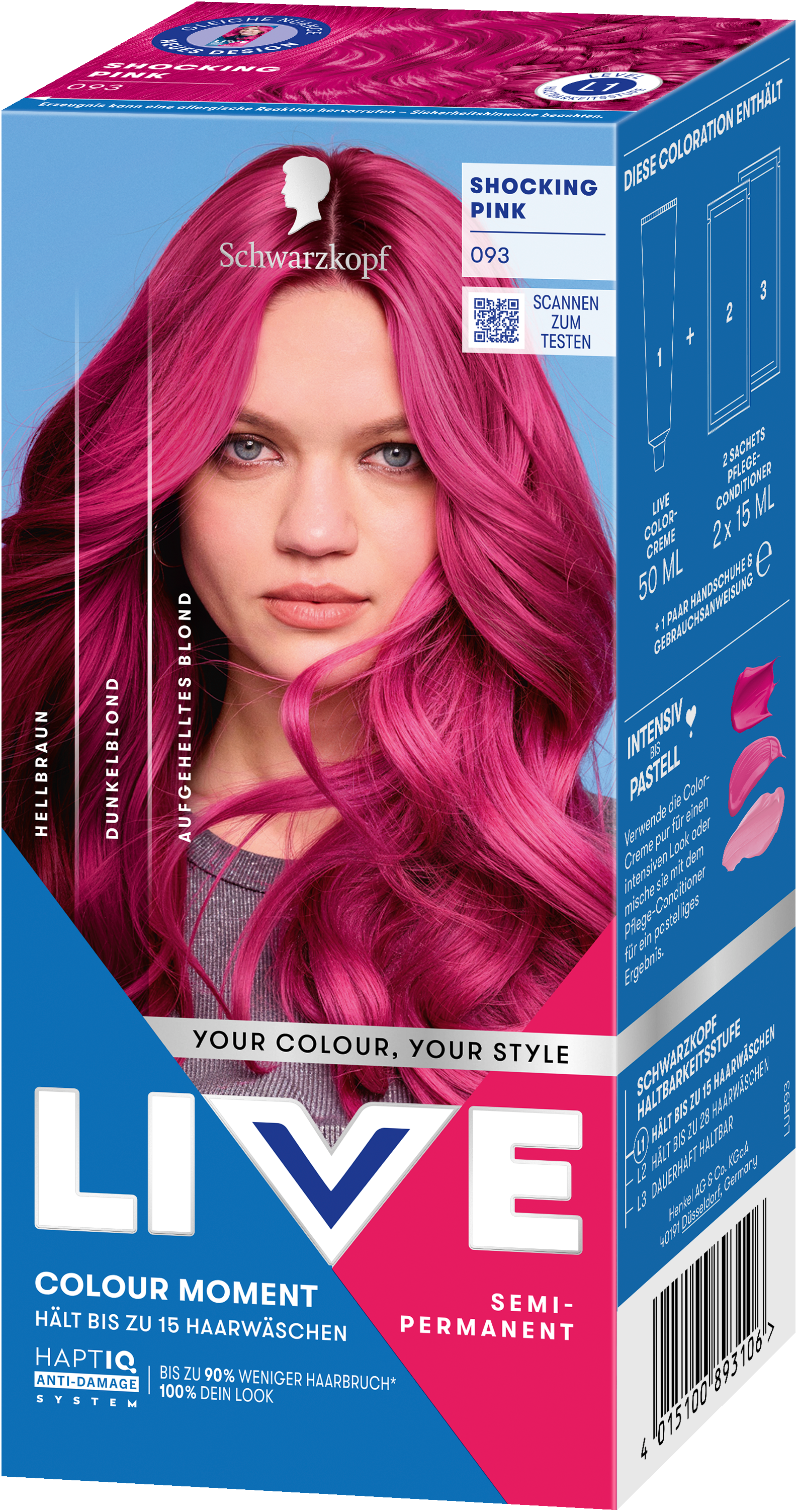 LIVE Intense Colour: für alle, die sich lang anhaltende, lebendige Haarfarben wünschen – ohne Kompromisse! Das integrierte HaptIQ Anti-Damage System schützt das Haar selbst bei den kühnsten Farbexperimenten und sorgt dafür, dass es strahlend gesund und wunderschön glänzend aussieht. Neu ist auch das beigefügte Sachet mit dem farbauffrischenden Glossing – entwickelt, um etwa drei bis vier Wochen nach der letzten Coloration eine zusätzliche Farbauffrischung zu geben. Für eine lang anhaltende, intensive Farbintensität und glänzendes Haar wie am ersten Tag.