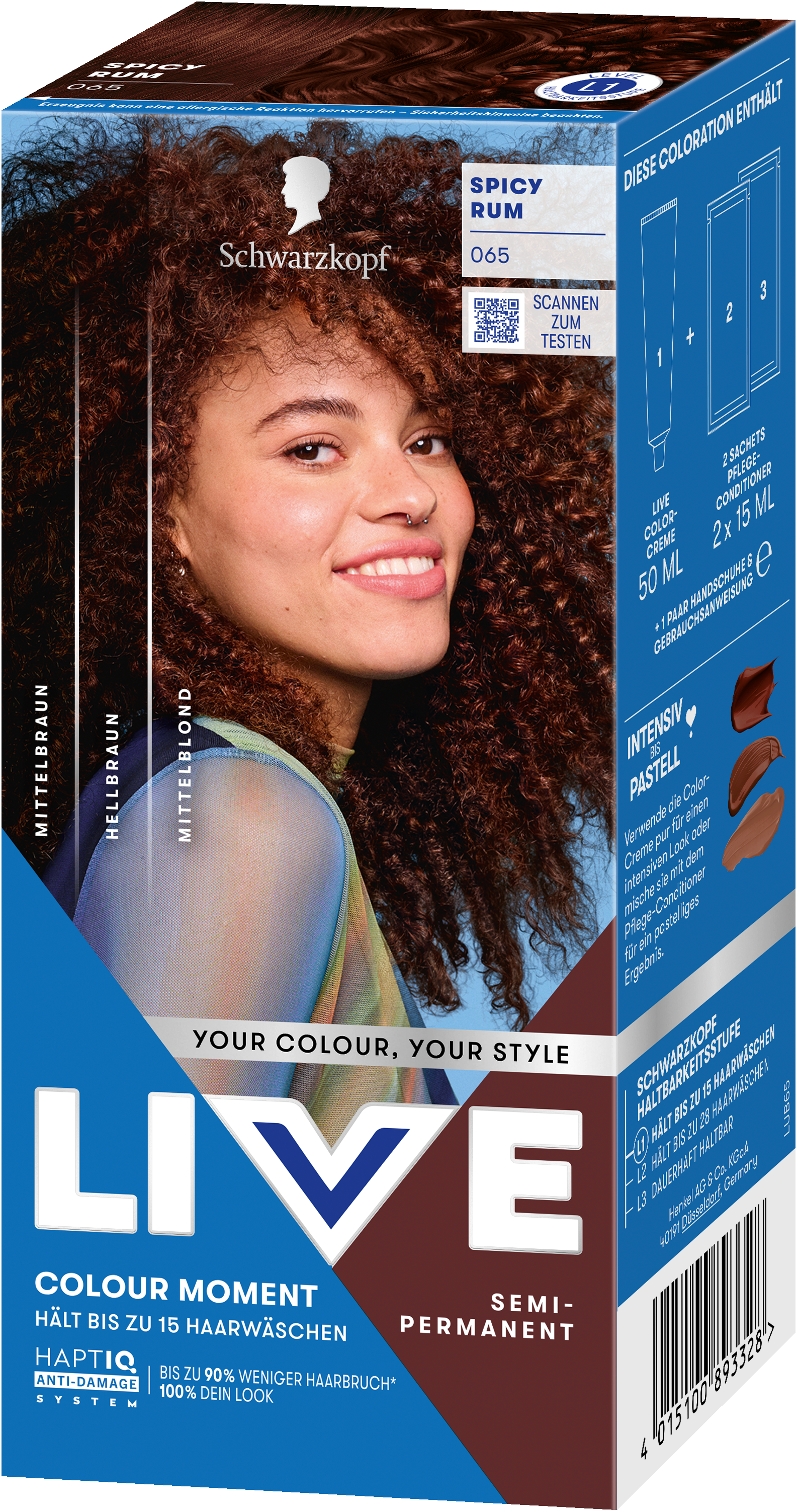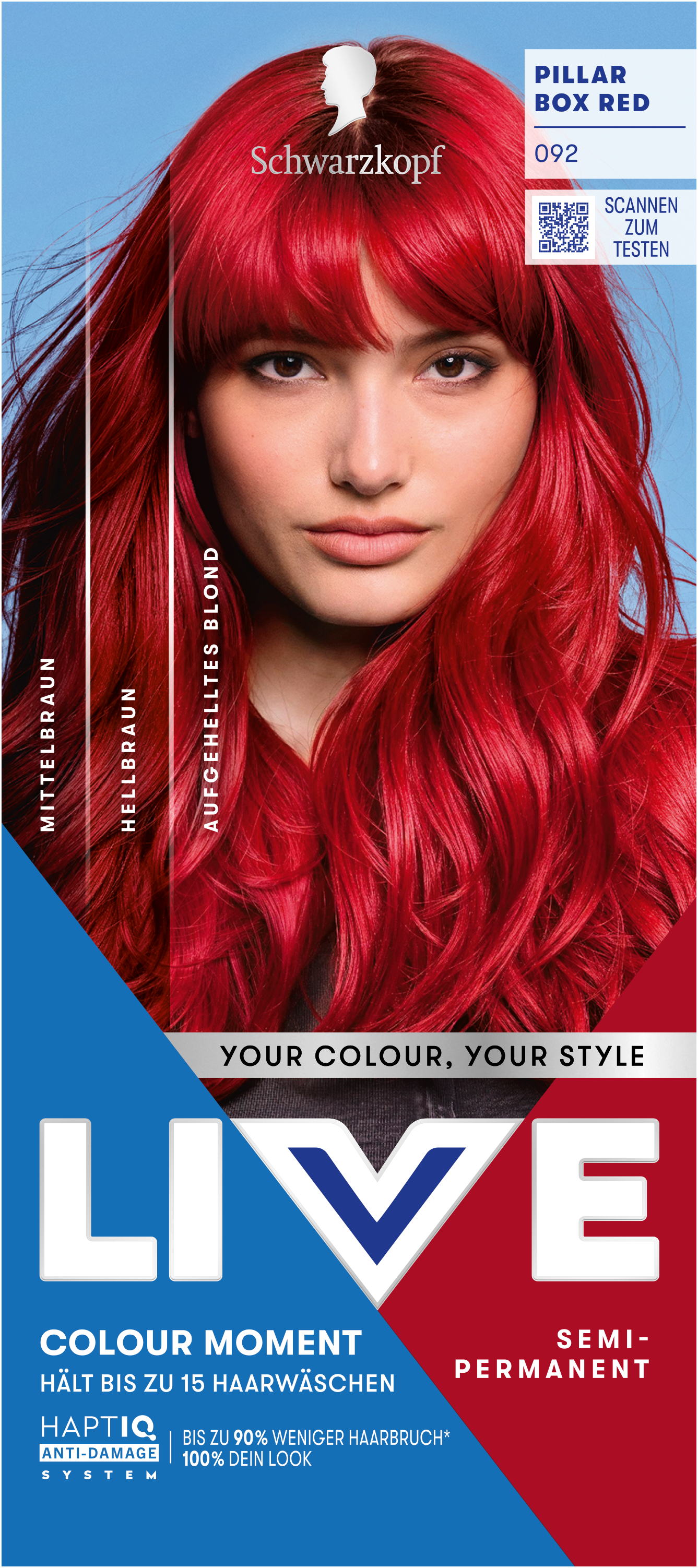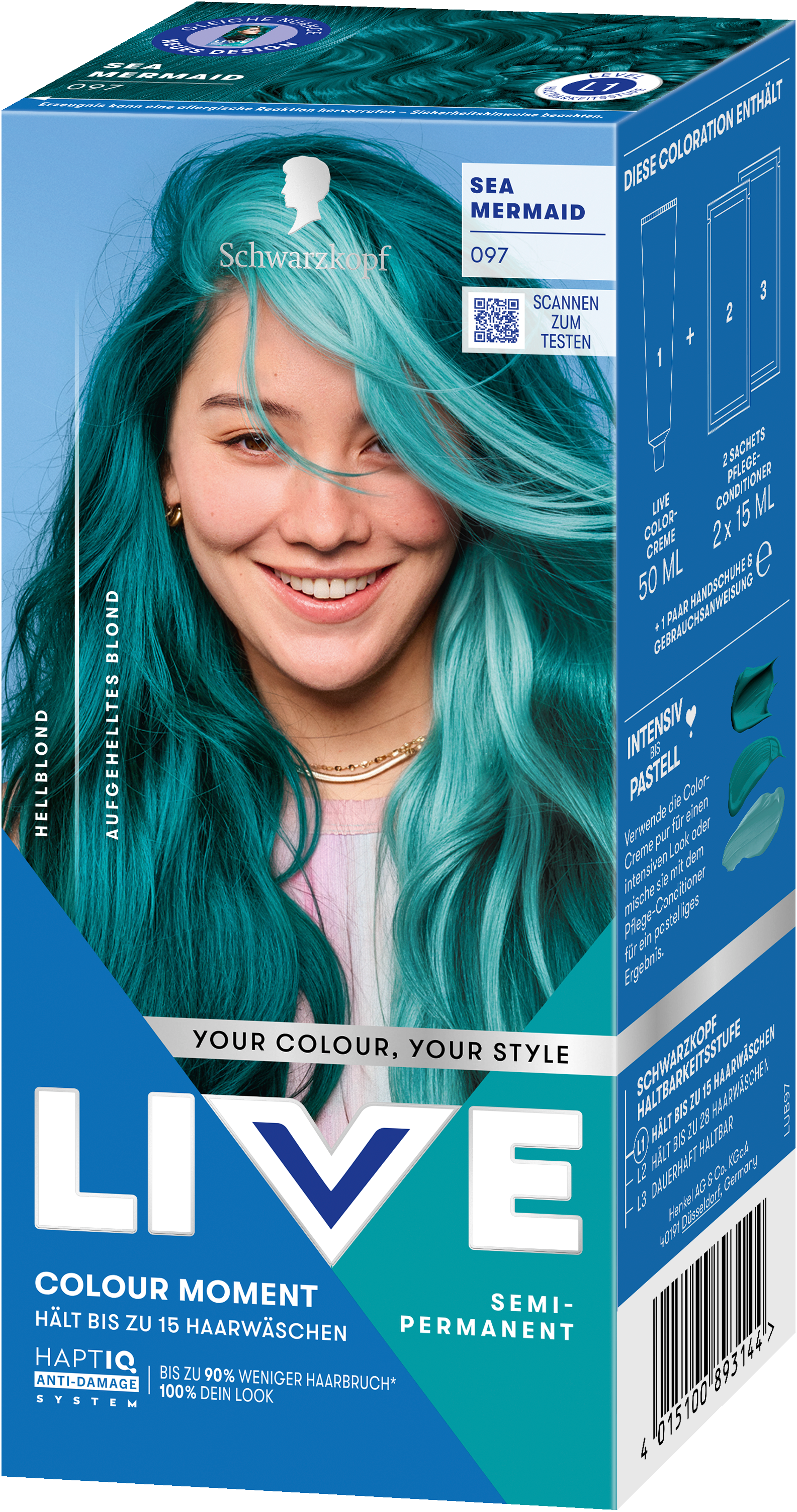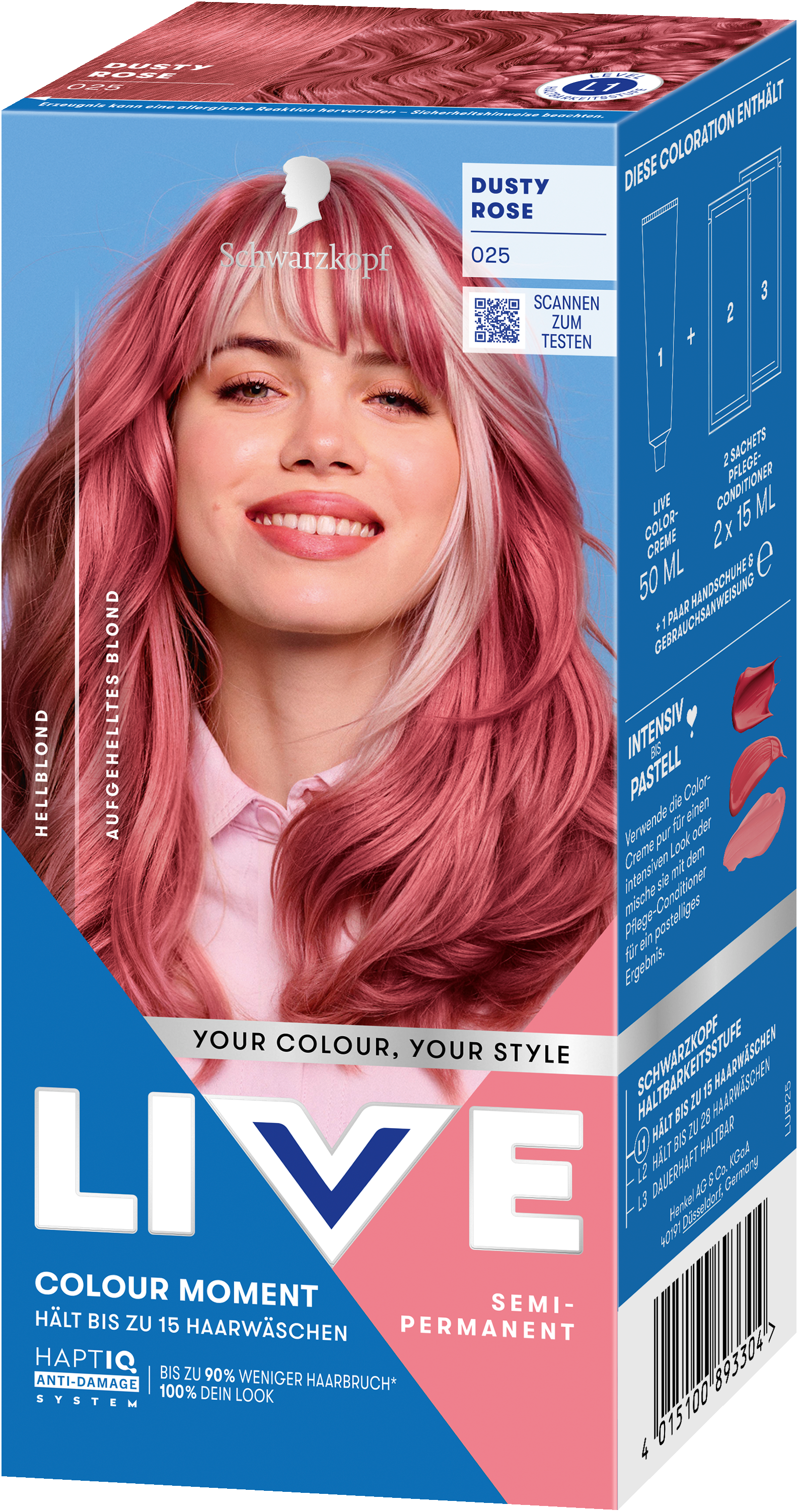 LIVE Intense Colour: für alle, die sich lang anhaltende, lebendige Haarfarben wünschen – ohne Kompromisse! Das integrierte HaptIQ Anti-Damage System schützt das Haar selbst bei den kühnsten Farbexperimenten und sorgt dafür, dass es strahlend gesund und wunderschön glänzend aussieht. Neu ist auch das beigefügte Sachet mit dem farbauffrischenden Glossing – entwickelt, um etwa drei bis vier Wochen nach der letzten Coloration eine zusätzliche Farbauffrischung zu geben. Für eine lang anhaltende, intensive Farbintensität und glänzendes Haar wie am ersten Tag.