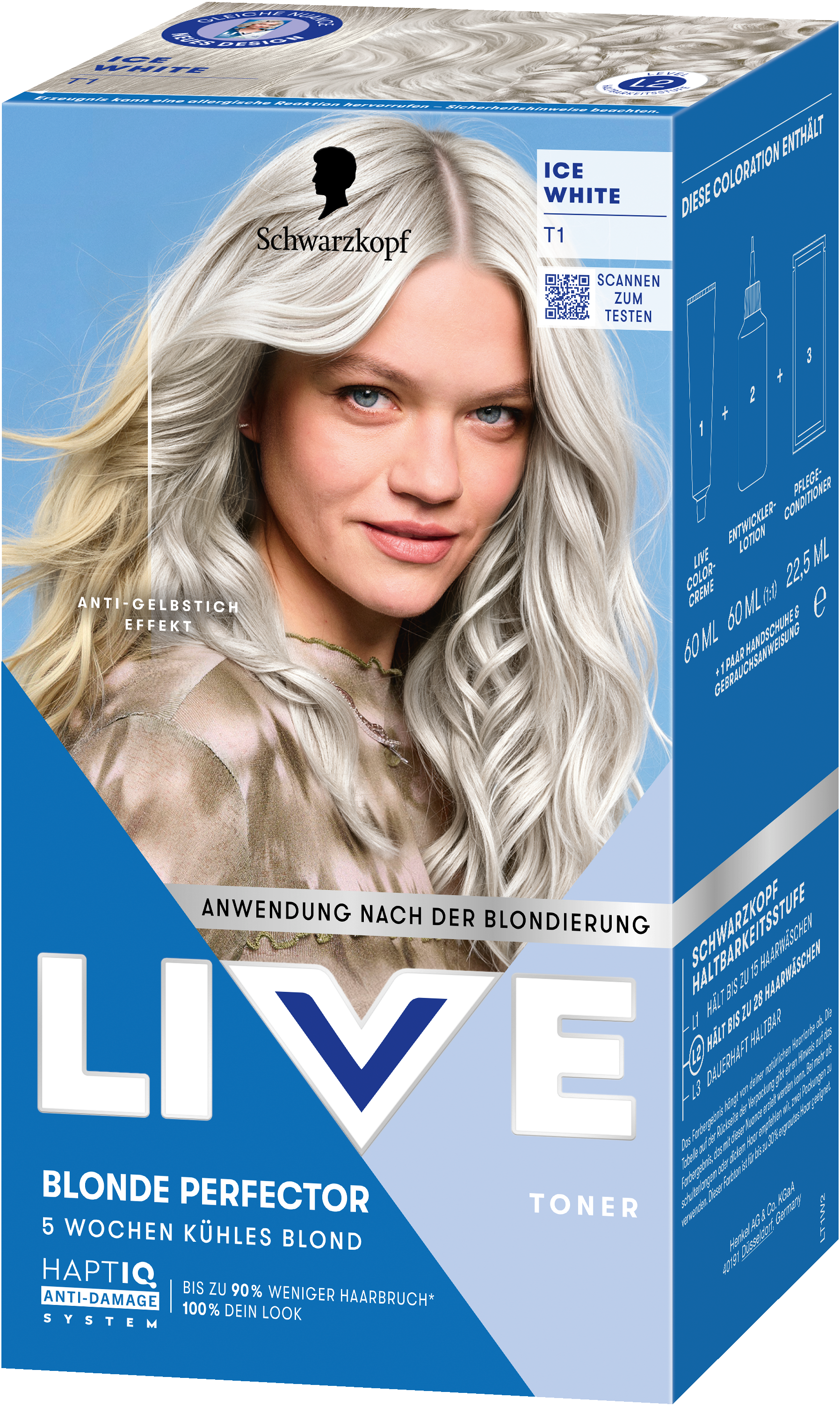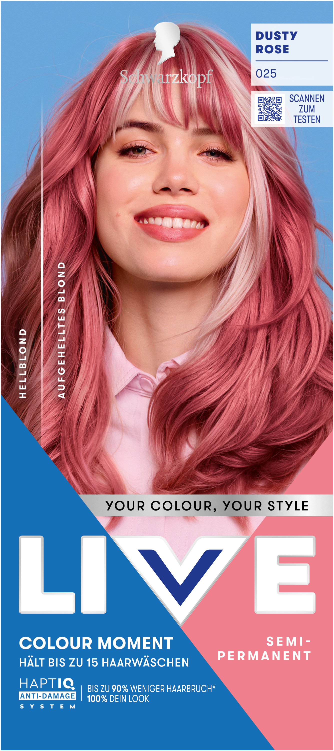 Das neue Schwarzkopf LIVE Design feiert Individualität: Mit frischen, kräftigen Farben und einem natürlichen, persönlichen Modelansatz macht das Design die Wahl deiner nächsten leuchtenden Haarfarbe intuitiv. Klare, bildbasierte Anwendungsanleitungen und ein virtueller Link zu einem Schritt-für-Schritt-Video machen den Colorationsprozess zu Hause einfach und stressfrei.