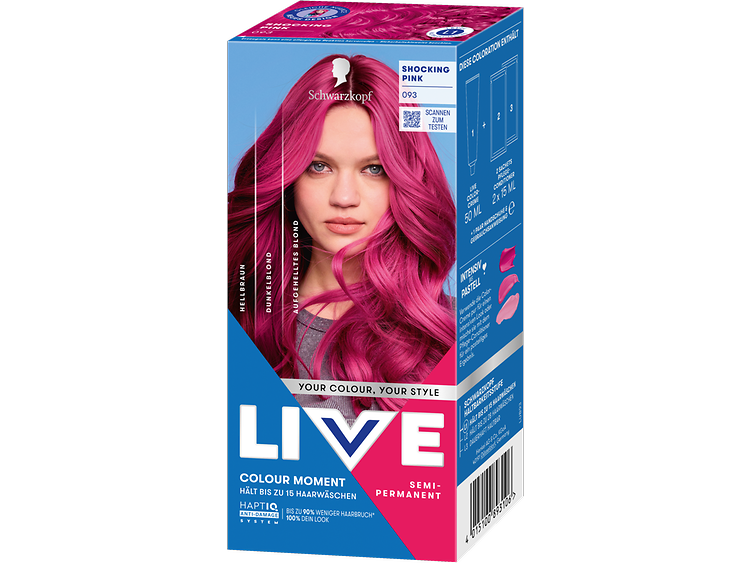 Schwarzkopf LIVE Colour Moment: perfekt für alle, die gern experimentieren! Colour Moment bietet eine erweiterte Palette an trendigen Nuancen und vielseitigen Anwendungsmöglichkeiten – von mutigen Komplettcolorationen bis hin zu spielerischen Highlights oder sanften Pastellspitzen, je nach gewählter Nuance sogar auf dunklerem Haar. Diese semipermanente Coloration hält bis zu 15 Haarwäschen lang und ist somit die ideale Wahl, um deinen Look spontan zu wechseln, wann immer dir danach ist. Der Relaunch bringt neue Styles und neue Nuancen – so kannst du ganz einfach verschiedene Facetten deiner Persönlichkeit ausdrücken.